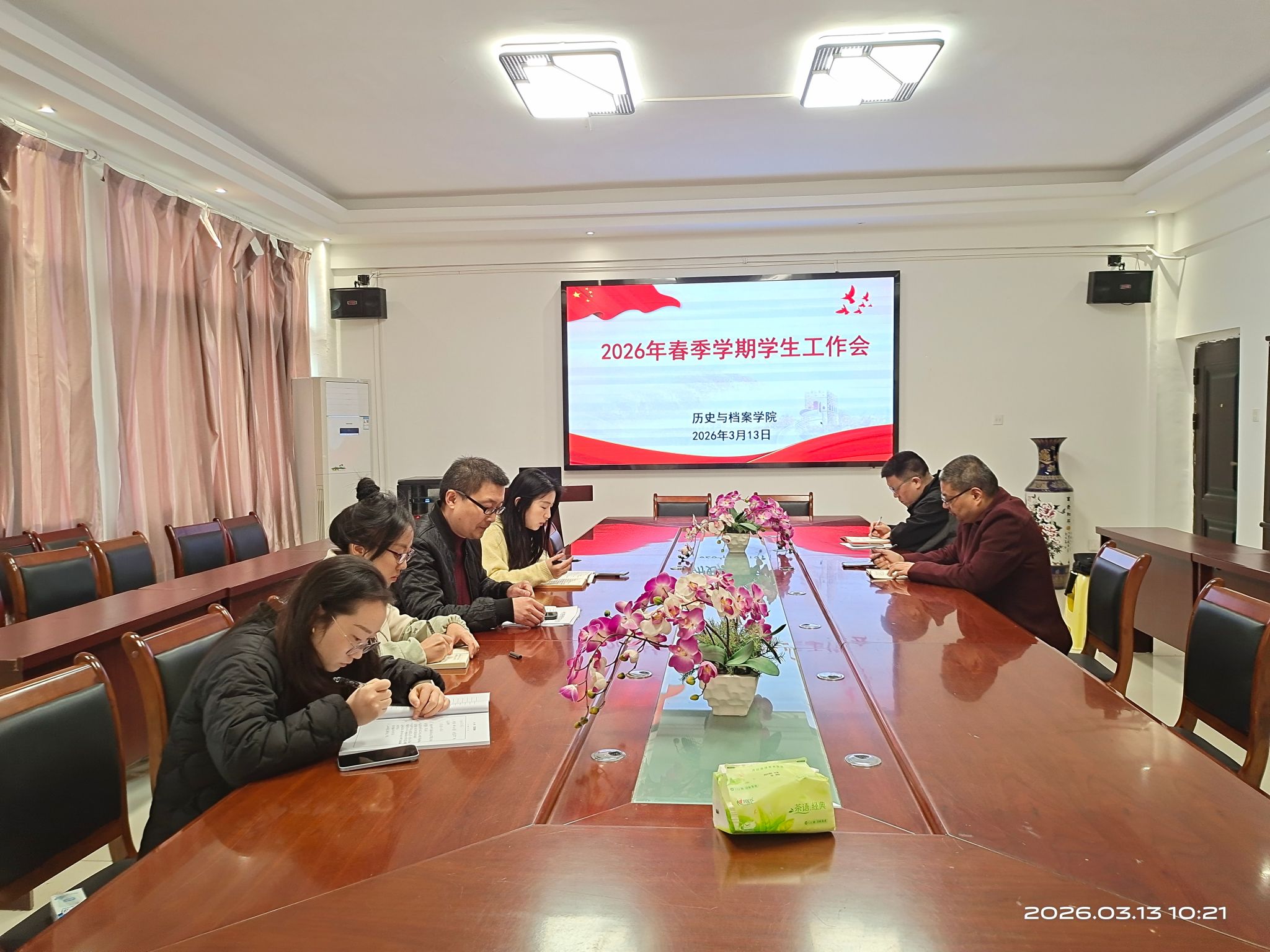 为全面落实学校学生工作部署,统筹推进新学期学生教育管理与服务保障,3 月 13 日,历史与档案学院召开 2026 年春季学期学生工作会议。院长万国崔、副院长蔡知远、团委副书记王秋实及全体专兼职辅导员参加会议,会议紧扣立德树人根本任务,明确重点、压实责任,为新学期学生工作高质量开展指明方向。