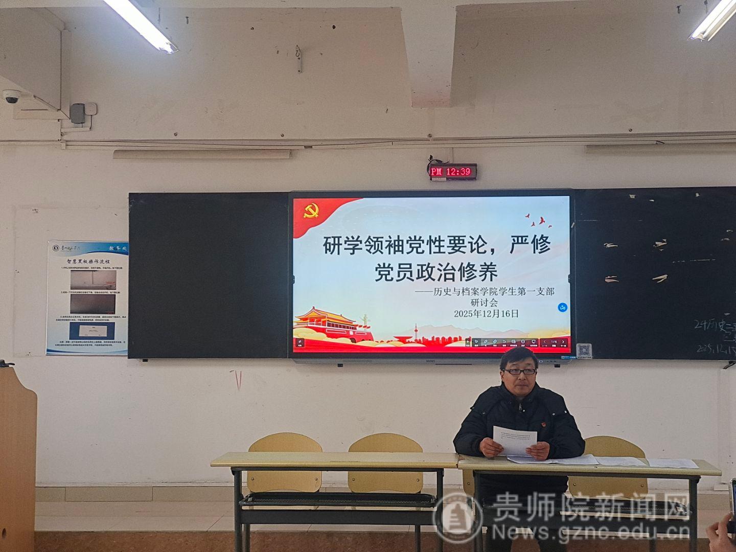 为深入学习贯彻习近平总书记关于党的建设的重要思想,进一步增强党员的使命感和责任感,12月16日,历史与档案学院学生第一党支部以“研学领袖党性要论,严修党员政治品格”为主题,在明德楼423开展党员基本培训第三次集中交流研讨活动。学生第一党支部全体党员通过线上+线下方式参与活动,会议由学生第一党支部书记鲁华进行主持。