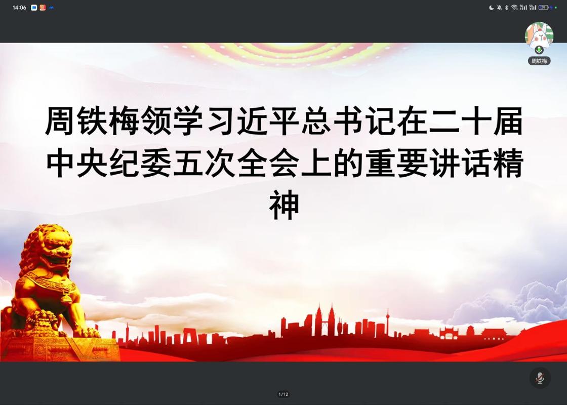 周铁梅同志领学习近平总书记在二十届中央纪委五次全会上重要讲话精神,以更高标准更实举措推进全面从严治党 为实现“十五五”时期目标任务提供坚强保障。强调要坚持和加强党的全面领导,以更高标准,更实举措推进全面从严治党,更加坚决有力地贯彻落实党中央重大决策部署,更加科学有效地把权力关进制度笼子,更加清醒、坚定地推进反腐败斗争,为实现“十五五”时期目标任务提供坚强保障。