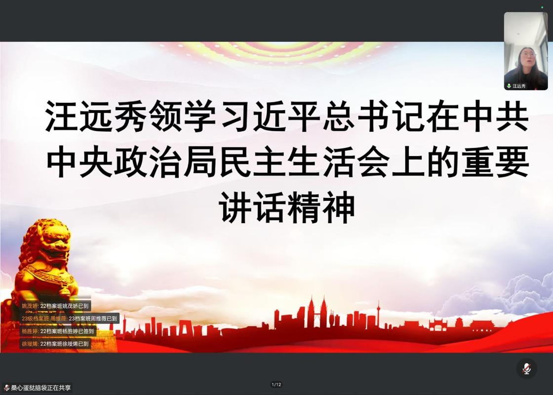 本网讯 为贯彻落实习近平总书记在中共中央政治局民主生活会、在二十届中央纪委五次全会上的重要讲话精神。历史与档案学院学生第二党支部于2026年1月15日通过腾讯会议开展以“严作风强治党 护航‘十五五’新征程”为主题的党日活动。历史与档案学院学生第二党支部全体党员通过线上形式参与主题党日活动,会议由汪远秀书记主持。