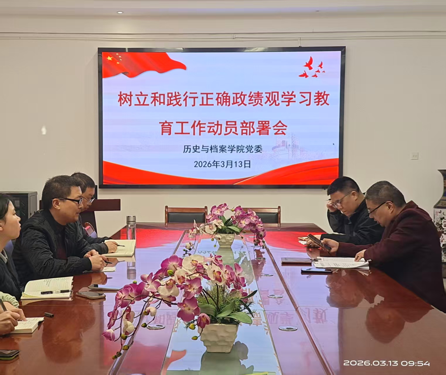 本网讯:为深入学习贯彻习近平总书记关于树立和践行正确政绩观的重要论述,推动历史与档案学院各项事业高质量发展。2026年3月13日,历史与档案学院党委在学院会议室召开树立和践行正确政绩观学习教育工作动员部署会。院长兼党委副书记万国崔出席会议并作总结讲话,学院党委班子成员、各党支部书记及老师代表参加会议。