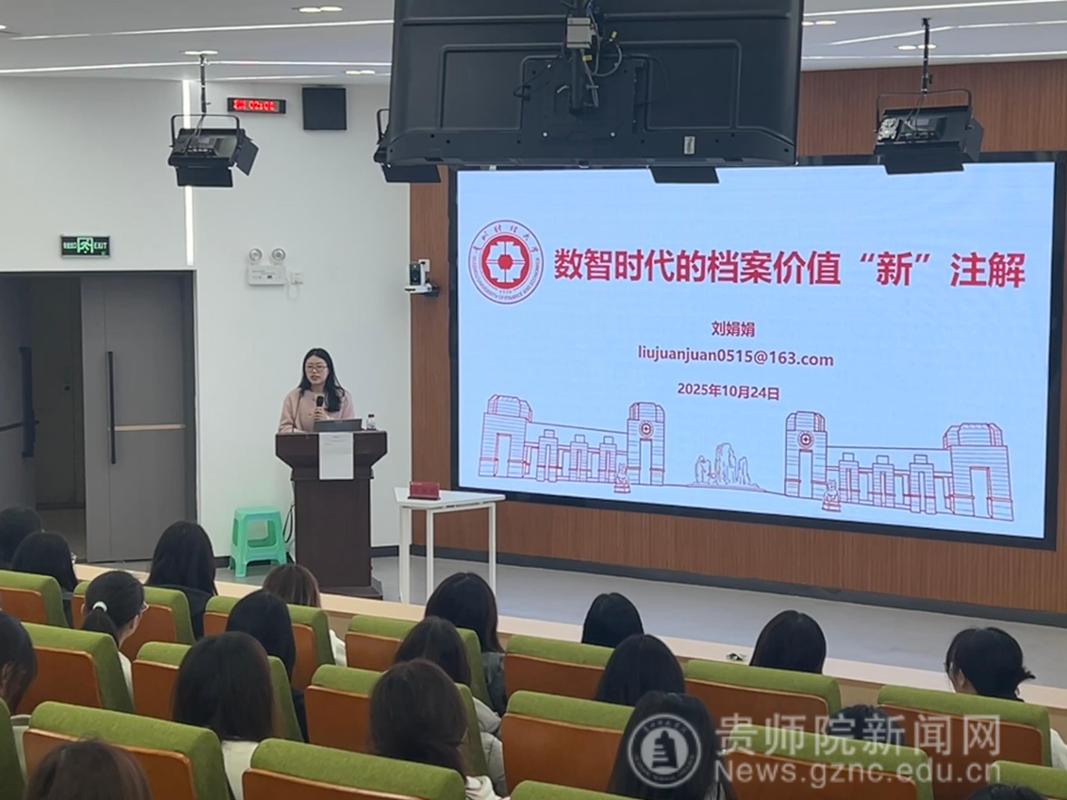 10月24日,由贵州省文史馆和贵州师范学院联合主办的“印山讲坛”系列之第十六期讲座,在宁静楼626成功举办。本期讲座的主题为“数智时代的档案价值‘新’注解”,主讲人为贵州财经大学信息学院教师、上海大学毕业的博士刘娟娟。历史与档案学院档案班师生约150人到场交流、学习。