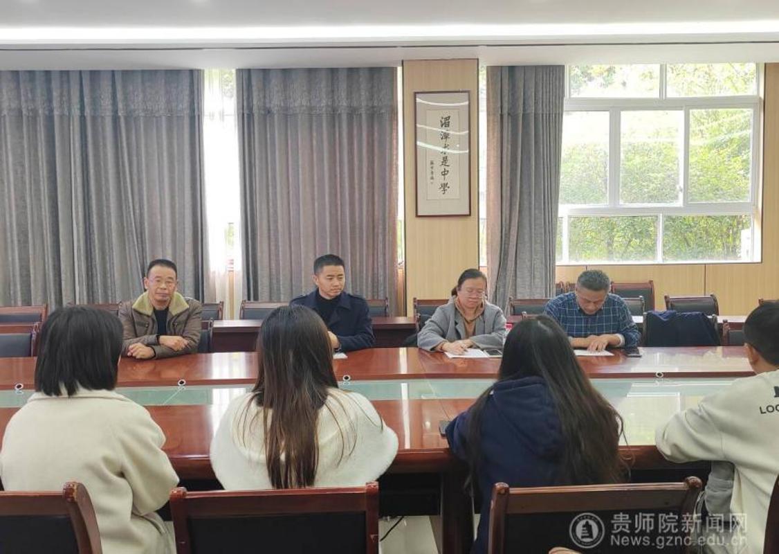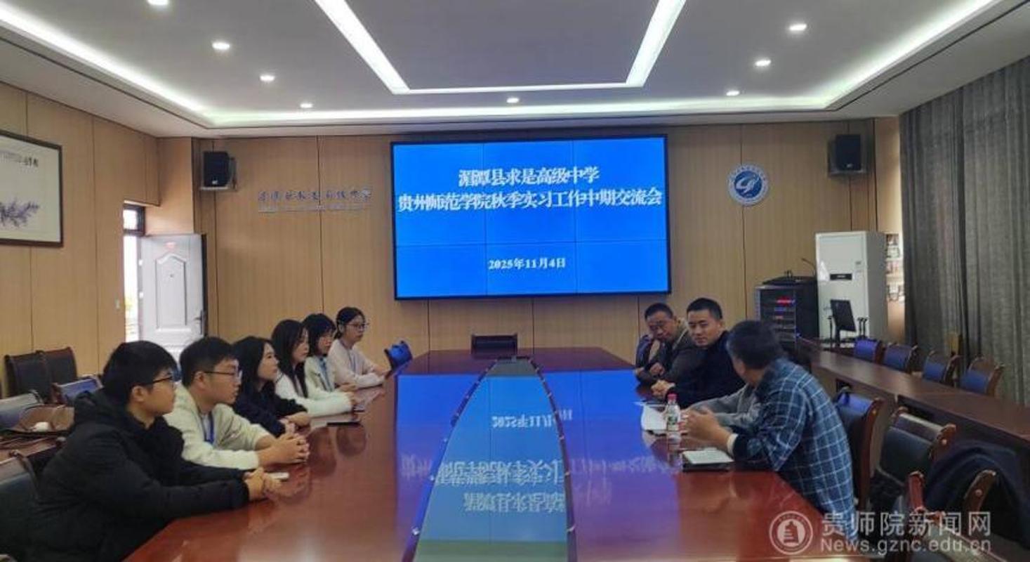 11月4日,湄潭县求是高级中学会议室暖意融融,贵州师范学院历史系主任梁中美副教授、教学督导朱更勇副教授专程到访,与湄潭求是高级中学教学副校长范朝红、实习指导老师代表安廷东老师会合,共同开展秋季实习学生中期慰问交流会,为师院实习学生送去关怀与专业指导。