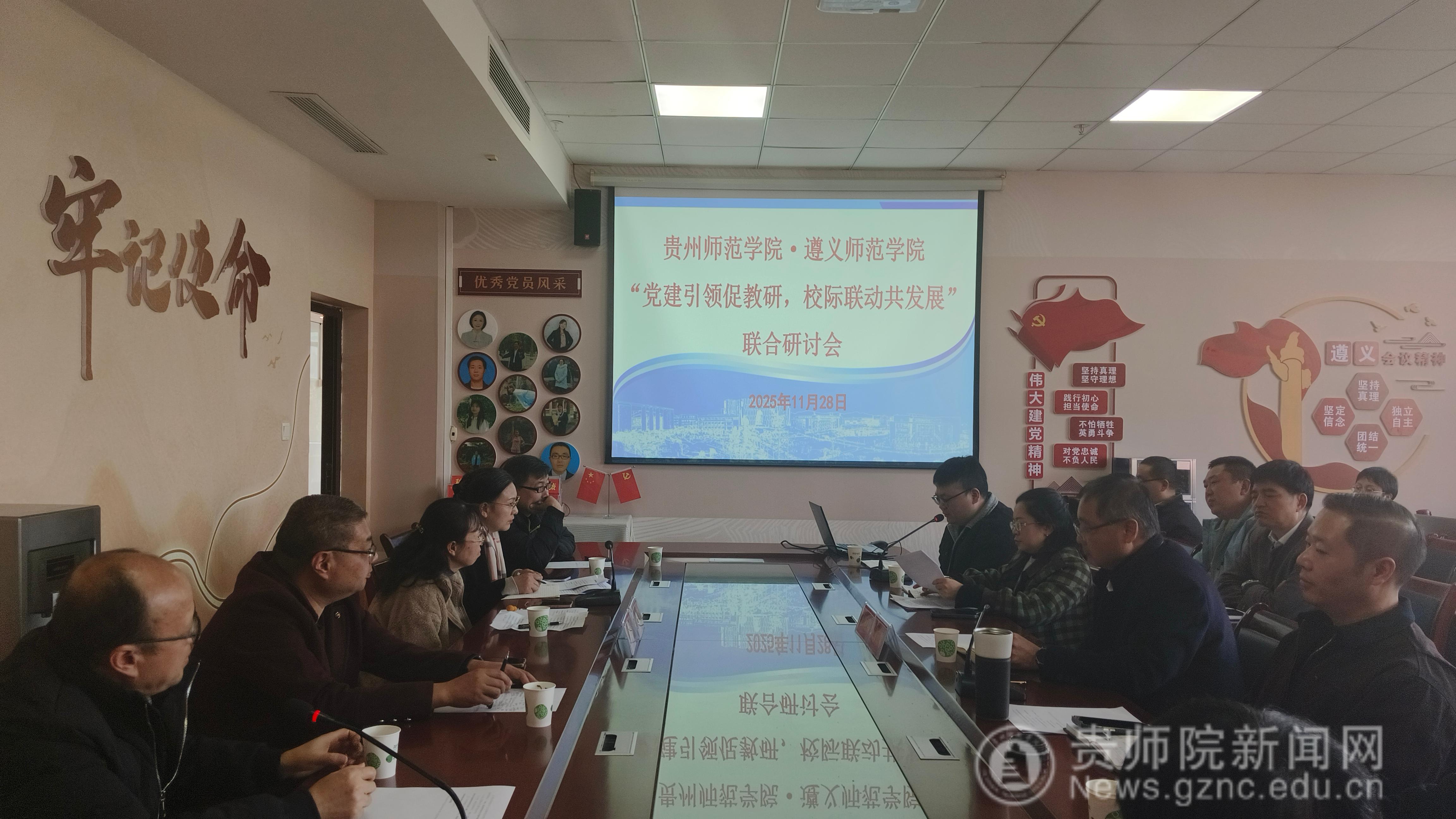 2025年11月28日,贵州师范学院历史与档案学院与遵义师范学院历史文化与旅游学院联合教研会,在遵义师范学院历史文化与旅游学院会议室召开。此次教研会以“党建引领促教研、校际联动共发展”为主题,旨在通过校际经验共享与思想碰撞,共同破解学科发展难题,推动历史学及相关专业高质量发展。