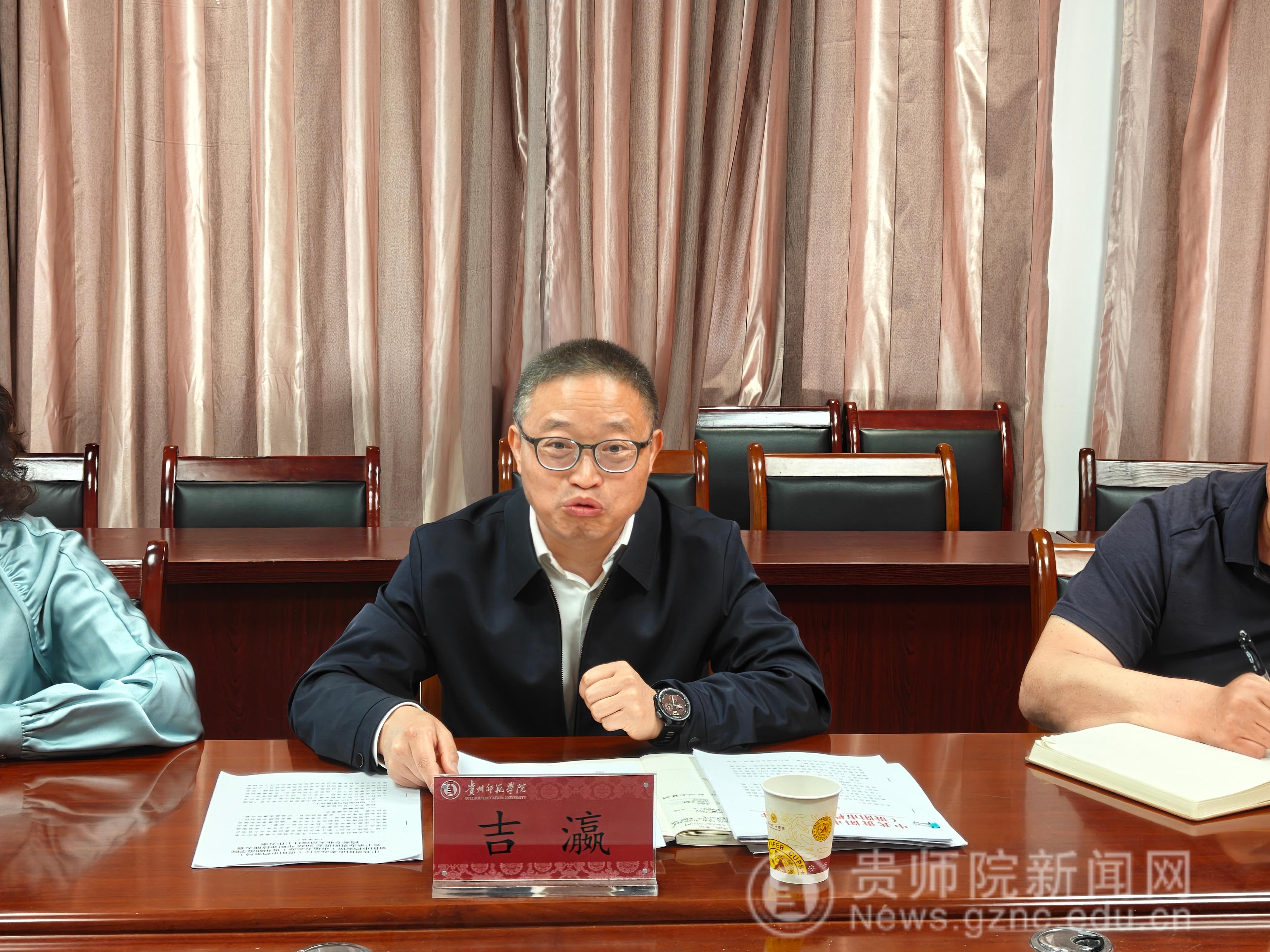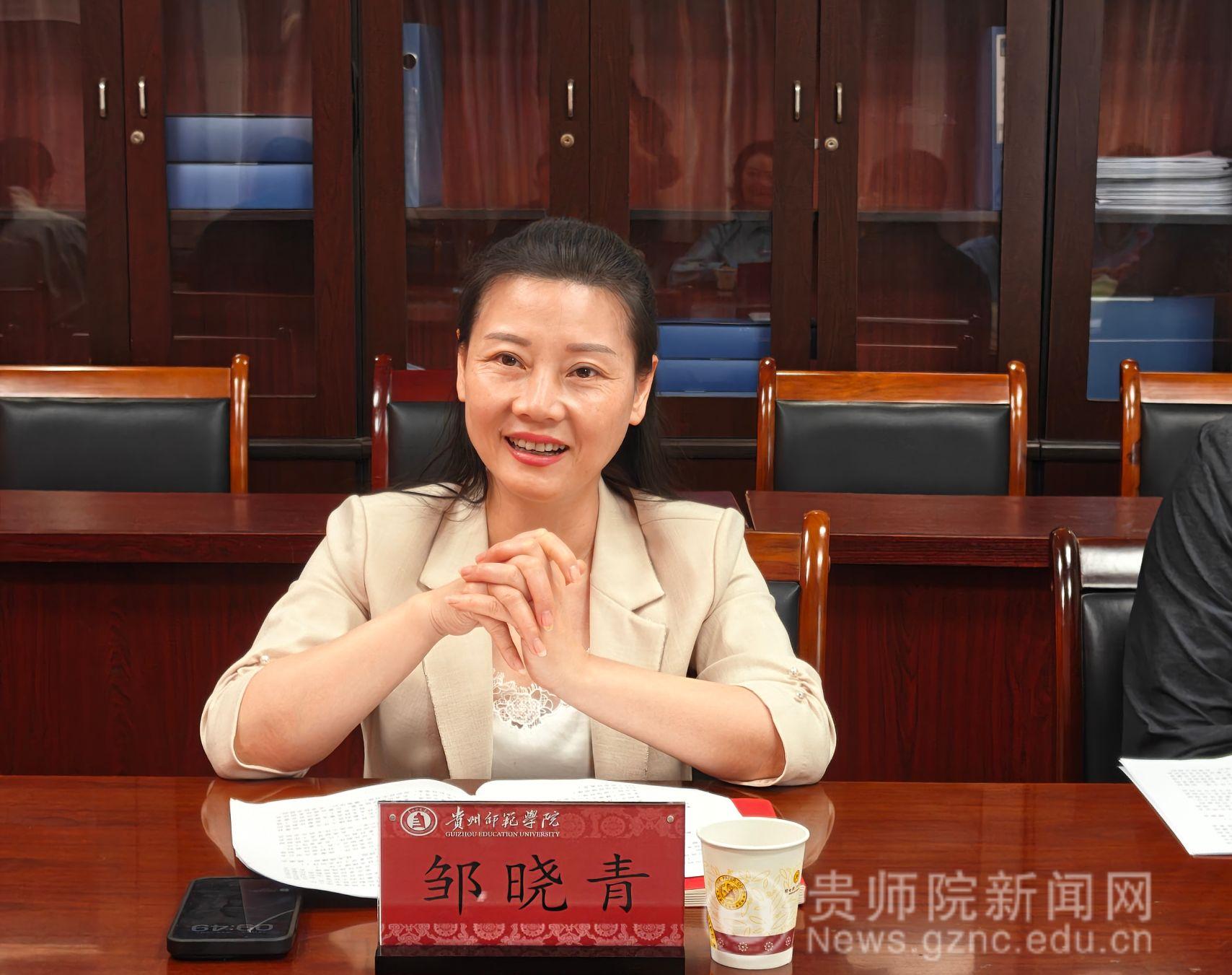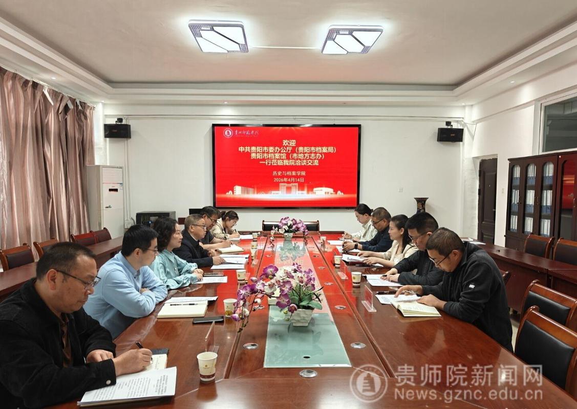 本网讯:4月14日,贵阳市委副秘书长、市档案局局长吉瀛,贵阳市档案馆(市地方志办)副馆长、副主任段洪一行,莅临贵州师范学院历史与档案学院,就承办贵阳贵安2026年职业技能大赛暨贵阳市第五届“筑城工匠杯”职工职业技能竞赛档案专业人员项目,开展专题洽谈。贵州师范学院党委副书记邹晓青教授,贵州师范学院历史与档案学院院长万国崔教授、副院长蔡知远教授,及档案系教师代表参与座谈。座谈会由万国崔主持,双方围绕赛事筹备、专业赋能、人才培育等核心议题深入研讨,推动档案事业技能提升与校地融合发展。