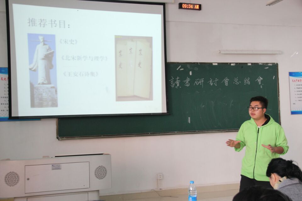 开学以来,16级历史学班级在专业老师的指导下利用晚自习和业余时间一直在开展读书会活动,此次研讨会是对本学期读书会的总结。会上,同学们围绕“读好书、好读书、书读好”为主题做汇报演讲,激情洋溢地汇报他们在本学期所看的书籍和受益之处,博得了同学们阵阵掌声。还结合专业知识穿插了精彩小品《熙宁之辩》,让在场的同学们在欢笑之余又增长了知识。老师听完汇报指出“读书是获取知识,增强阅历的主要途径,读书能传承中国传统文化,尤其是我们历史学专业的同学,更应多读书、读好书,积累知识,把更多丰富的知识运用到生活和工作中去。希望同学们再接再厉,把读书会办得更好。”