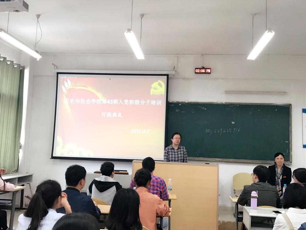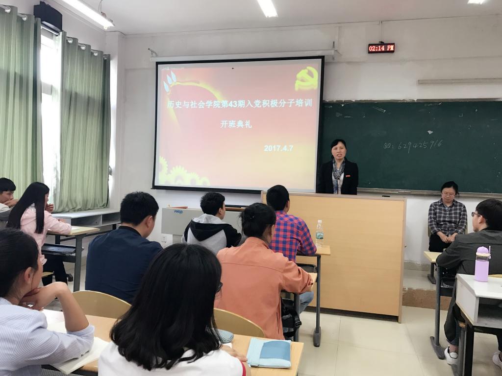 根据《中国共产党章程》、《中国共产党发展党员工作细则》、《贵州省发展党员工作规程(试行)》的要求和学校《关于举办贵州师范学院第43期入党积极分子培训班的通知》精神,历史与社会学院4月7日下午在明理楼405教室举行了第43期入党积极分子培训班开班动员会。参加会议的有,学院基层党委副书记吴靖霞、学生党支部书记梁中美、学院办公室副主任任艳华、部分学生党员及46名入党积极分子。