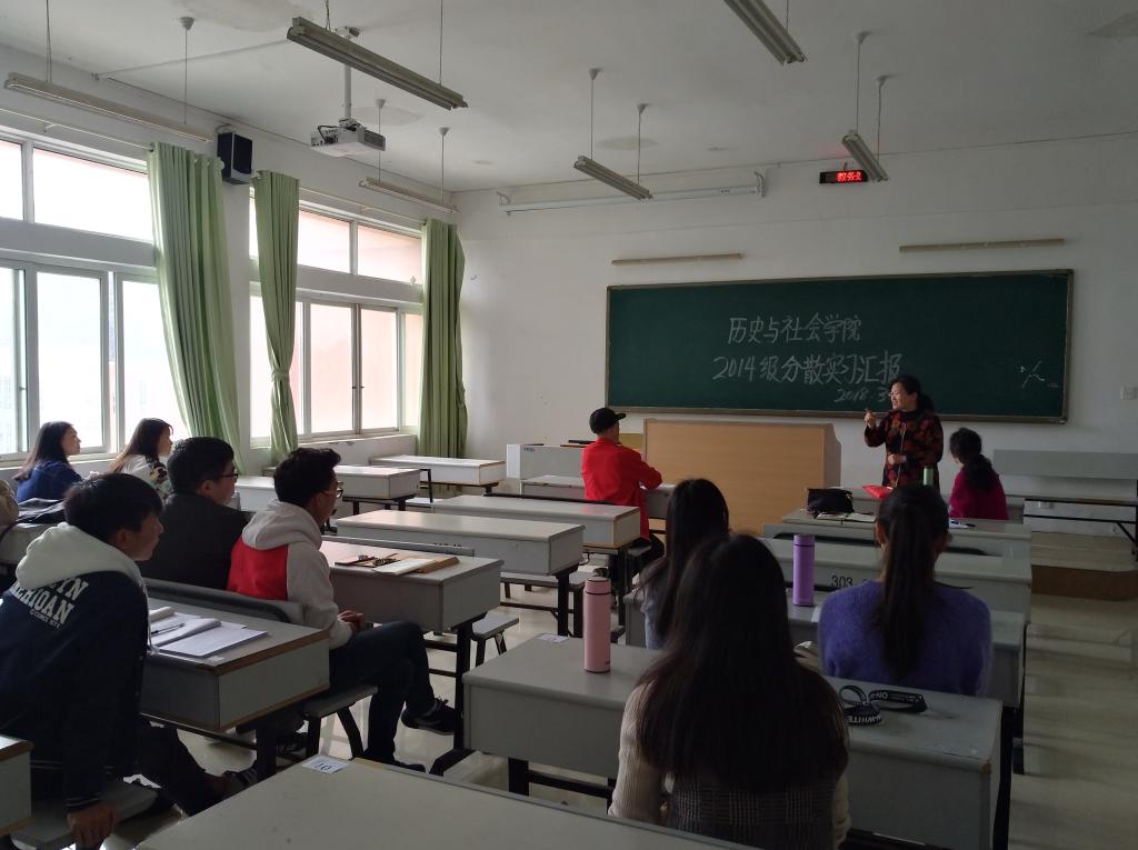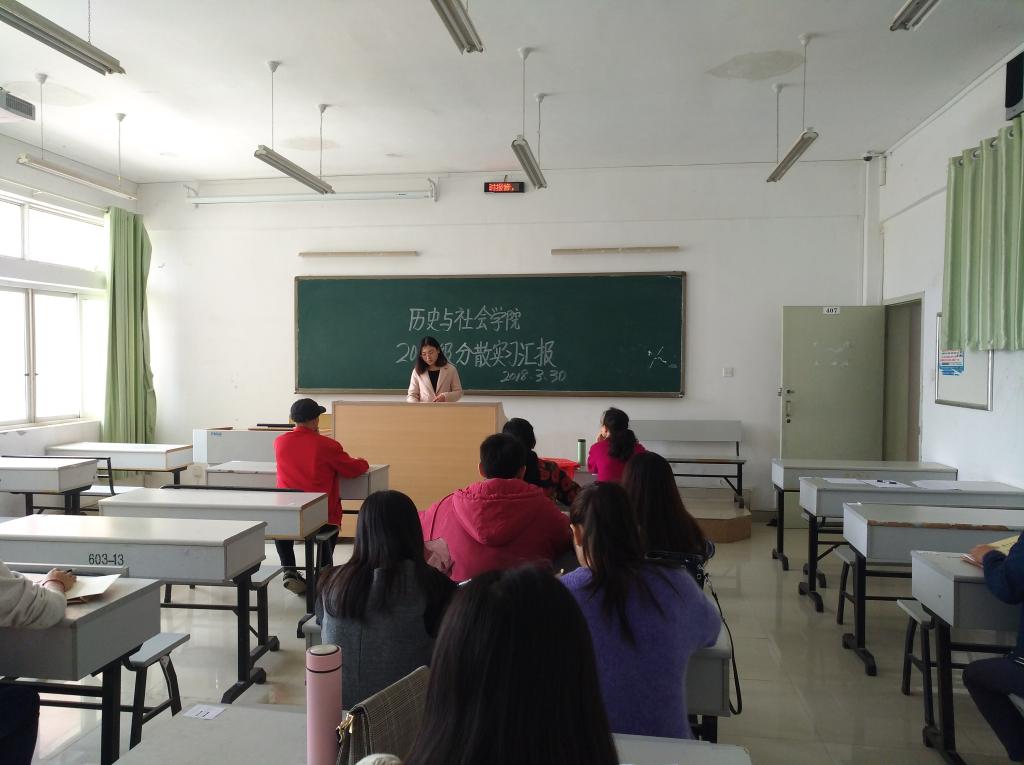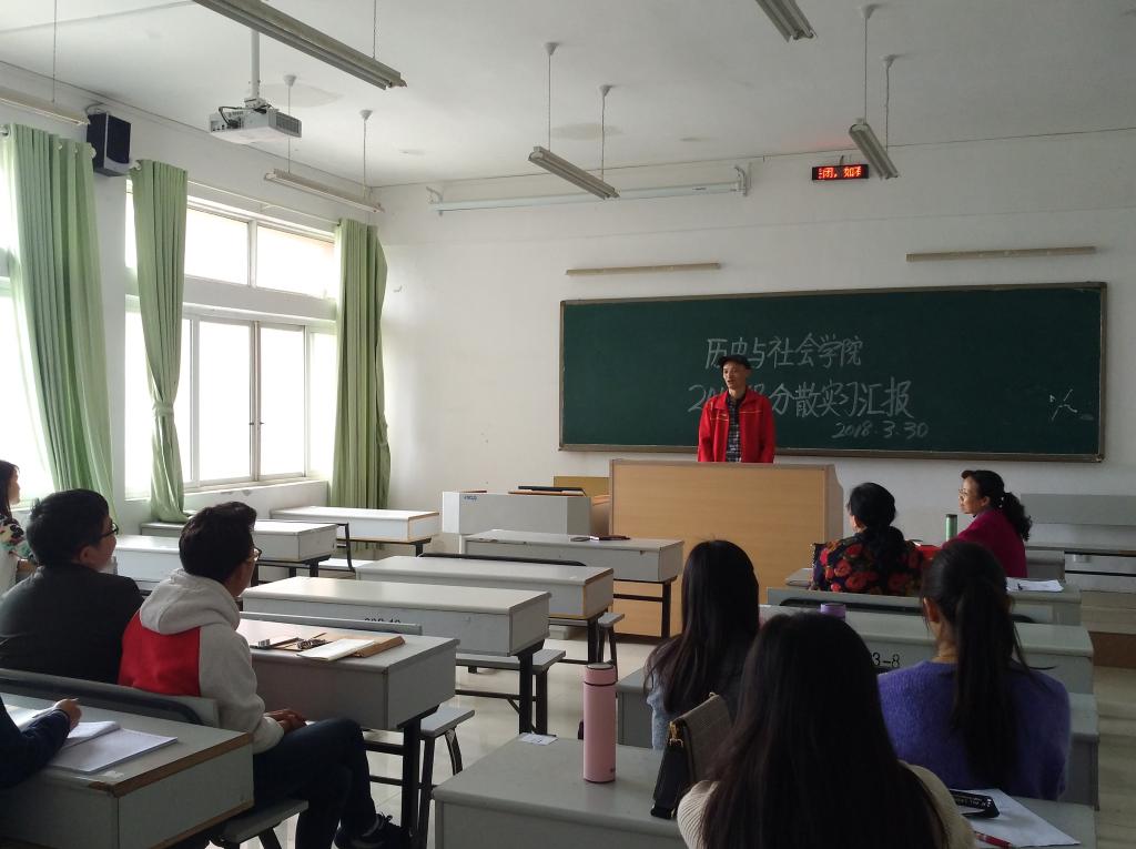 为进一步加强对分散实习的管理和监控,避免分散实习流于形式。3月30日下午2点,历史与社会学院组织2018届历史学专业17名分散实习生在明理楼407教室进行了分散实习汇报。参加此次汇报会的有学院院长申满秀、副院长魏郭辉、历史系主任杜景、历史系副主任张勇等老师。