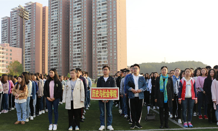 4月9日早上,历史与社会学院全体学生在学校田径运动场举行了升国旗仪式。在学院基层党委副书记吴靖霞、各班辅导员、基层团委学生会的组织下,同学们站成整齐的队伍,期待着升国旗仪式的开始。