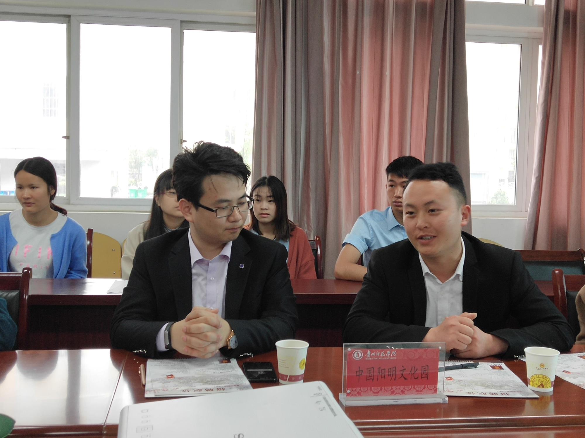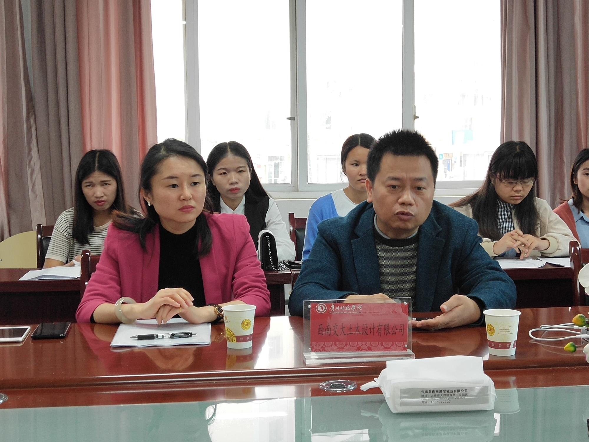出席招聘会现场的有西南交大土木设计有限公司(贵州分公司)总经理姚胜成及其助理,中国阳明文化园办公室主任刘进波,贵州旅游投资集团有限公司办公室副主任张鲁斌,恒宇科技有限公司办公室主任何家华,历史与社会学院院长申满秀、基层党委副书记吴靖霞以及毕业班辅导员李瑞平等,历史与社会学院2018届毕业生参加了此次招聘宣讲会。招聘会由吴靖霞主持。