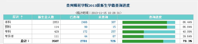 目前我校新生学籍自查率如下表(数据来源:教育部学信网络平台,统计时间:2013年11月15日10:28)。