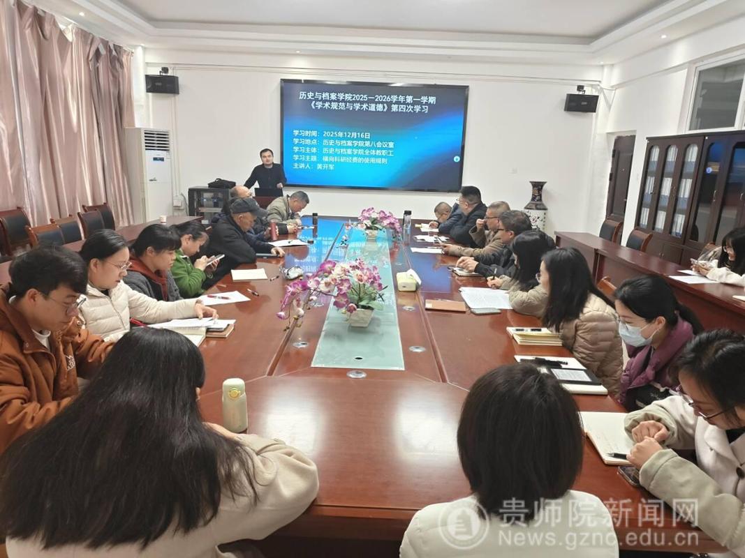 本网讯:2026年3月6日,历史与档案学院在第八会议室,召开《学术规范与学术道德》课程首次集中学习会,聚焦“横向科研经费使用规则”。学院全体教职工参加,科研秘书黄开军博士担任主讲。